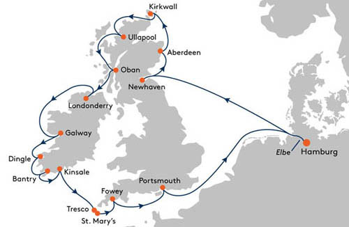Kreuzfahrtroute von MS Europa (Gesamtansicht )