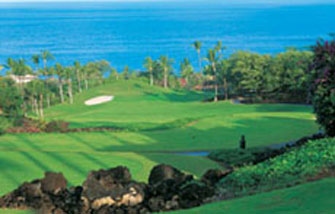 Nur etwa 10 Minuten zu Fuß vom Hotel entfernt baute Robert Trent Jones II einen Golfplatz in eine phantasti- sche Natur hinein. Die Landschaft präsentiert sich immer wieder in wunderschönen Panoramablicken. Golf Maga- zine und Golf Digest ordneten den Platz unter den 10 er- sten der Resort Anlagen ein. Er zeigt sich klassisch glatt, aber eben auch rau und zerklüftet. Die Fairways werden von Lavafelsen, Kiwisträuchern, hohem Hawaii-Gras und alten Steinwällen eingerahmt. Es gibt lange und kurze Bahnen; teilweise sichtbare Lava und 93 Bunker sind zu beachten. Höhenunterschiede von 60 bis 70 m müssen überwunden werden. Der Platz verlangt eine sorgfältige Auswahl von Schläger und Landefläche des Balls. |